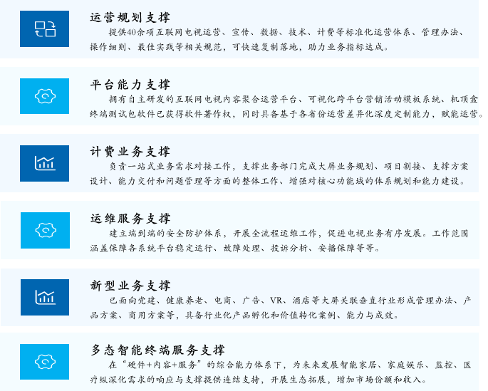 以提升互联网电视增值业务收入为目标,开展互联网电视内容运营工作,包括运营规划、产品运营、平台能力、计费业务、测试运维等服务。