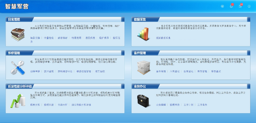 根据军队业务特点及装备特点,为军营装备交接、使用、保养、维修等日常任务定制化的智慧军营系统,通过数据对装备的状态进行监控,并为人员日常管理等业务提供电子化数据依据。